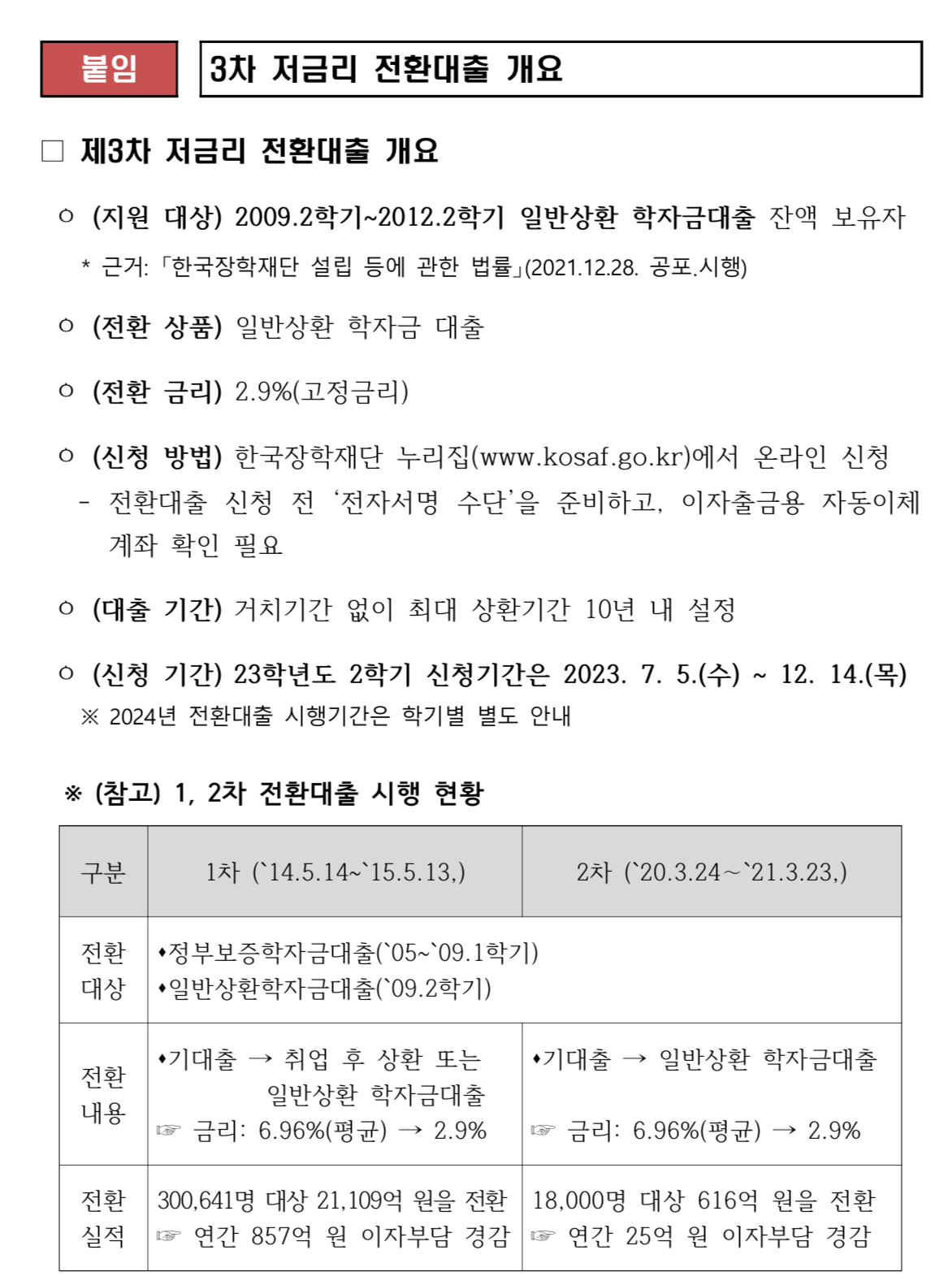 교육부(부총리 겸 교육부장관 이주호)와 한국장학재단(이사장 배병일)은 2023년 7월 5일(수)부터 12월 14일(목)까지 2023학년도 2학기 저금리 전환대출을 신청 받고 있다고 합니다.