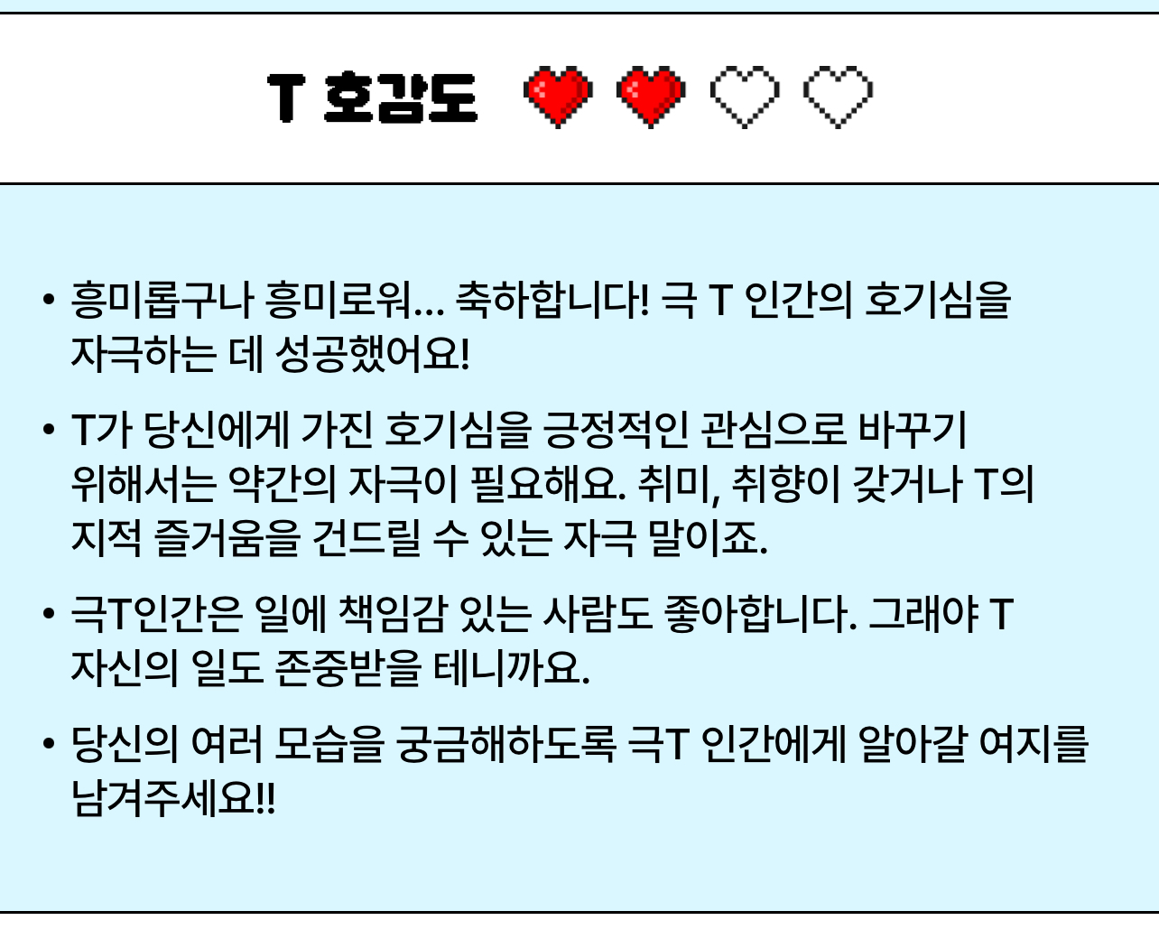 • 당신의 여러 모습을 궁금해하도록 극 T 인간에게 알아갈 여지를 남겨주세요!!