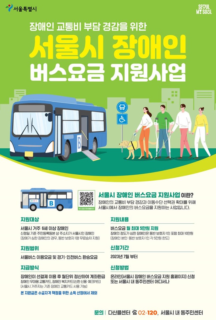 서울시에 거주하고 있는 장애인에게 서울버스를 이용하거나 수도권 버스로 환승한 요금을 월 5만원까지 지원하고 있습니다.