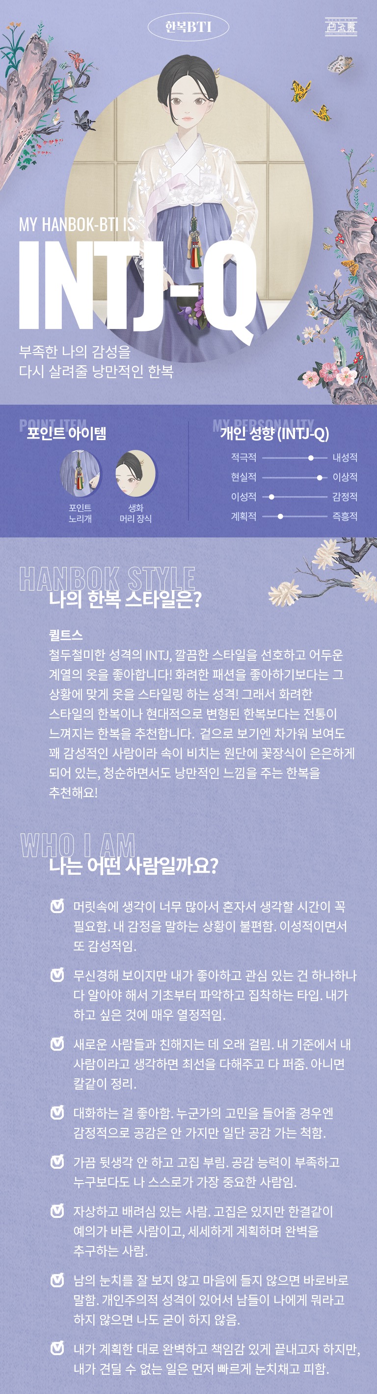 겉으로 보기엔 차가워 보여도 꽤 감성적인 사람이라 속이 비치는 원단에 꽃장식이 은은하게 되어 있는 청순하면서도 낭만적인 느낌을 주는 한복을 추천해요!