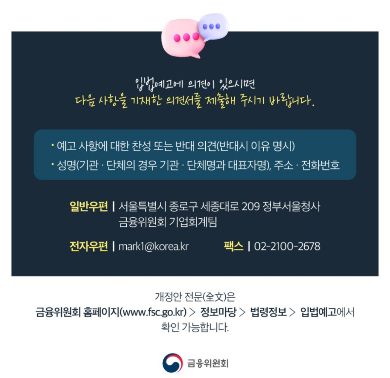 개정안 전문은 금융위원회 홈페이지>정보마당 법령 정보>입법예고에서 확인 가능합니다.