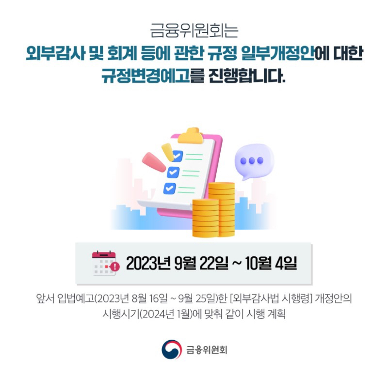 금융위원회는 외부감사 및 회계 등에 관한 규정 일부개정안에 대한 규정변경예고를 진행합니다.