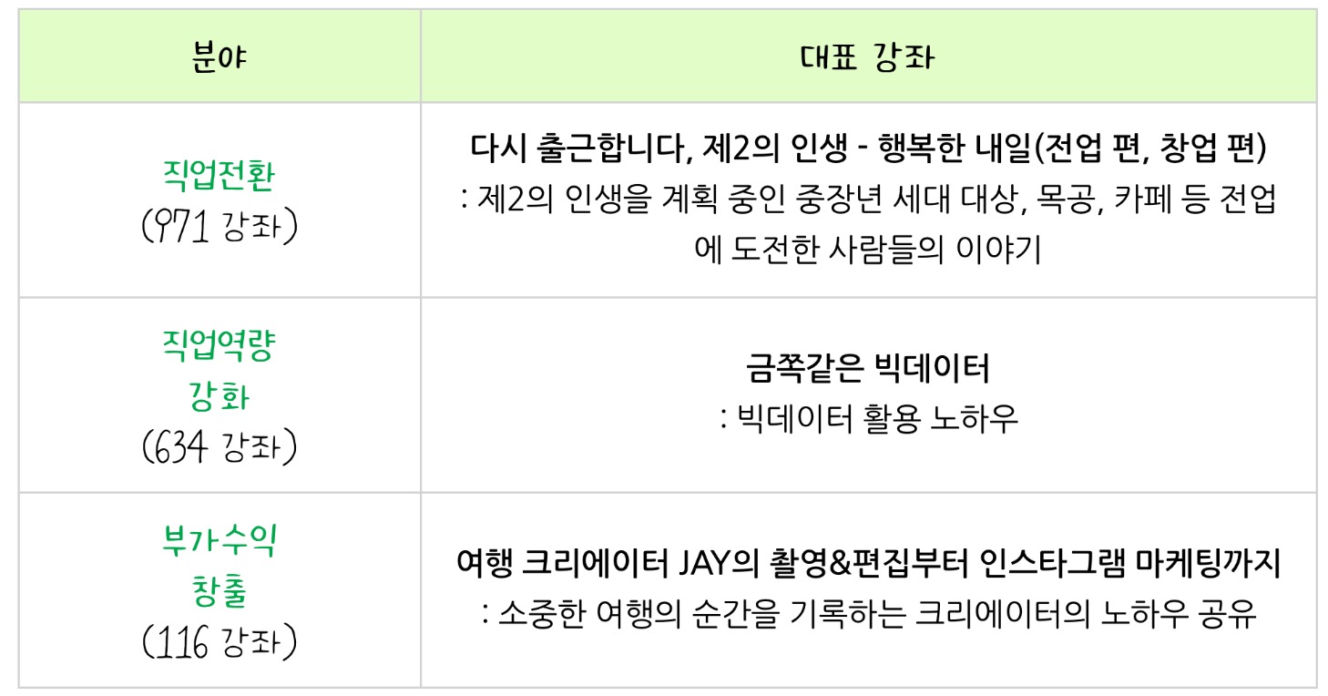 ➡️직업전환 분야에서는 제2의 인생을 계획 중인 중장년 세대를 대상으로 목공, 카페 등 전업에 도전한 사람들의 이야기를 들려주는 ‘다시 출근합니다, 제2의 인생 – 행복한 내일(전업 편, 창업 편)’ 강좌를 수강할 수 있다.
