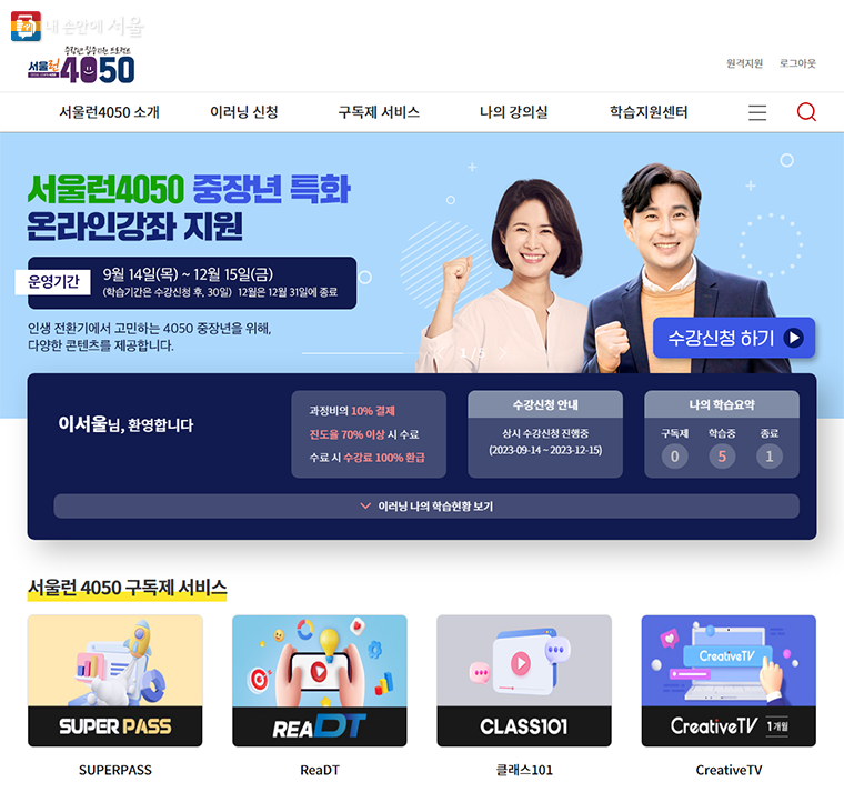 서울시가 2023년 9월 14일부터 서울 거주 중장년을 대상으로, 안정적인 인생 전환기를 맞이할 수 있도록 서울런4050을 통해 중장년 특화 온라인 강좌를 유료콘텐츠까지 확대해 제공한다고 합니다.