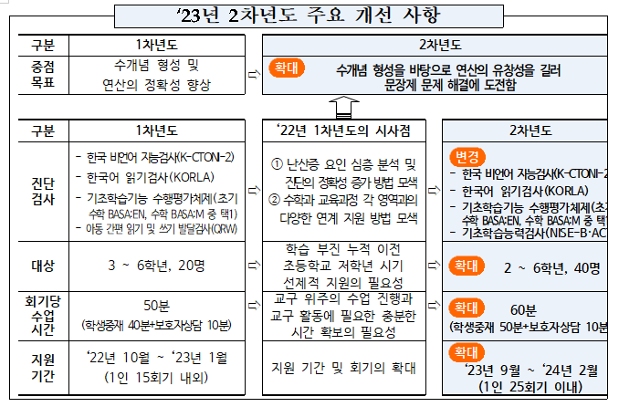 1차년도 시범사업*에서는 ‘심층진단-학생 맞춤형 중재지원 프로그램-학부모 및 교사 상담 지원’의 단계별 기틀을 마련하며 지원 대상 학생의 수개념 형성 및 연산의 정확성 향상에 목표를 두었다고 합니다.