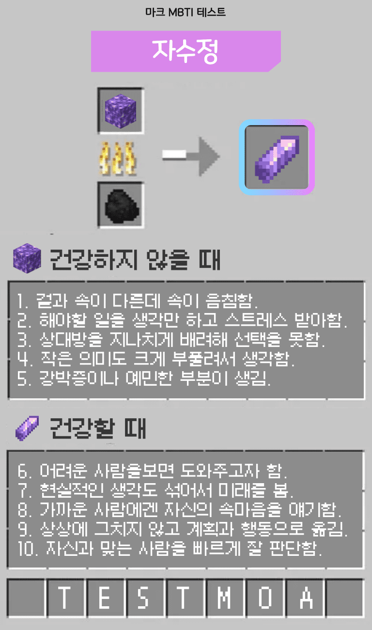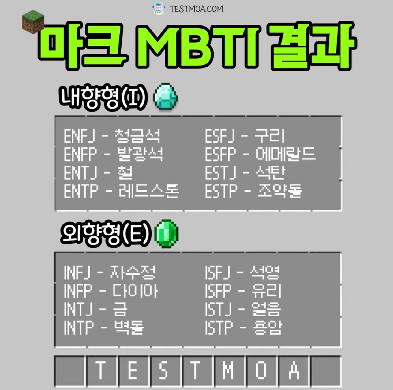 테스트모아라는 사이트에서 마인크래프트 아이템과 관련된 mbti 테스트가 나왔는데 테스트 소개와 더불어 mbti 유형 결과까지 안내드리겠습니다.