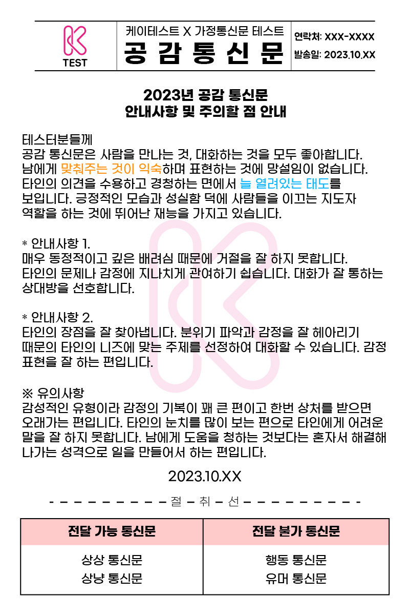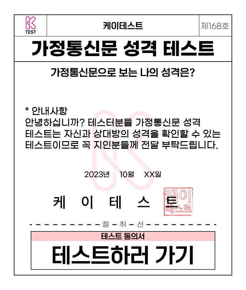 케이테스트에서 가정통신문으로 보는 나의 성격은 어떨지 알아보는 재미난 테스트가 있다고 해서 소개해드리려고 합니다.