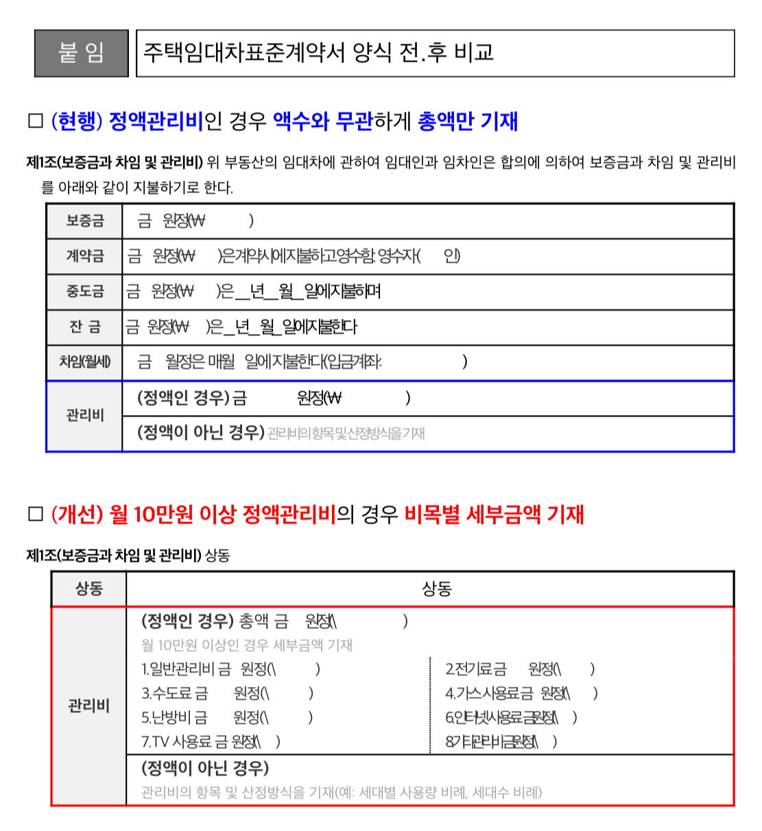 2023년 10월 6일(금)부터 전월세 계약 시 월 10만원 이상 정액관리비의 부과내역을 세분화하여 표기할 수 있도록 주택임대차표준계약서 양식이 개선된다고 합니다.
