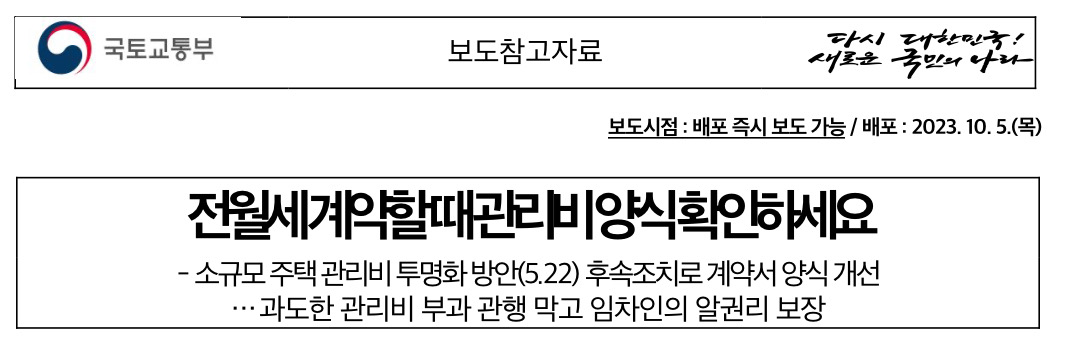마지막으로 국토교통부 원희룡 장관은 “지난 5월 초 실효성 있는 대책을 위하여 현장을 방문한 후 마련한 ‘소규모 관리비 투명화 방안’을 발표하고 후속조치가 차질 없이 추진되도록 총력을 기울여 왔다”면서, “깜깜이 관리비를 예방하고 ‘제2의 월세’로 악용되는 구조를 차단할 수 있도록 전월세 계약 시 개정된 표준계약서를 적극적으로 활용해 주길 부탁한다”라고 밝혔습니다.
