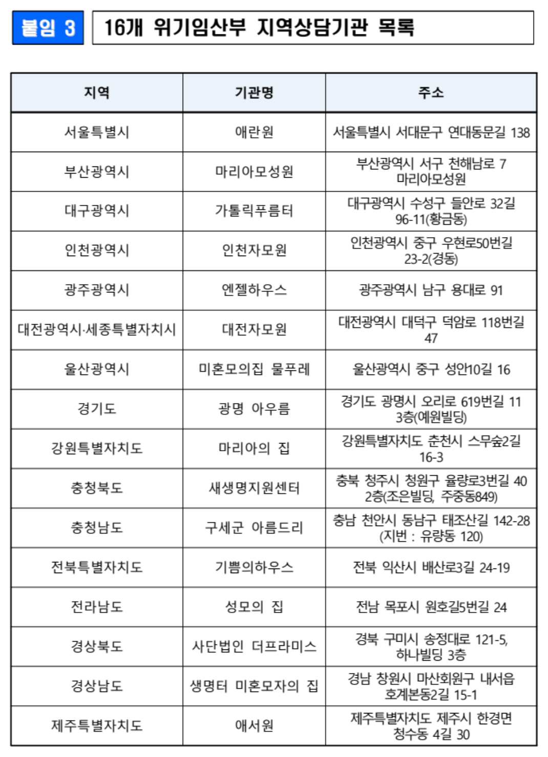 전국 17개 시도에 16개 위기임산부 상담기관이 설치되어서 그동안 다양한 기관에서 분절적으로 제공되던 임신ㆍ출산ㆍ양육 관련 상담과 지원을 보다 체계적으로 받을 수 있게 되었다고 합니다.