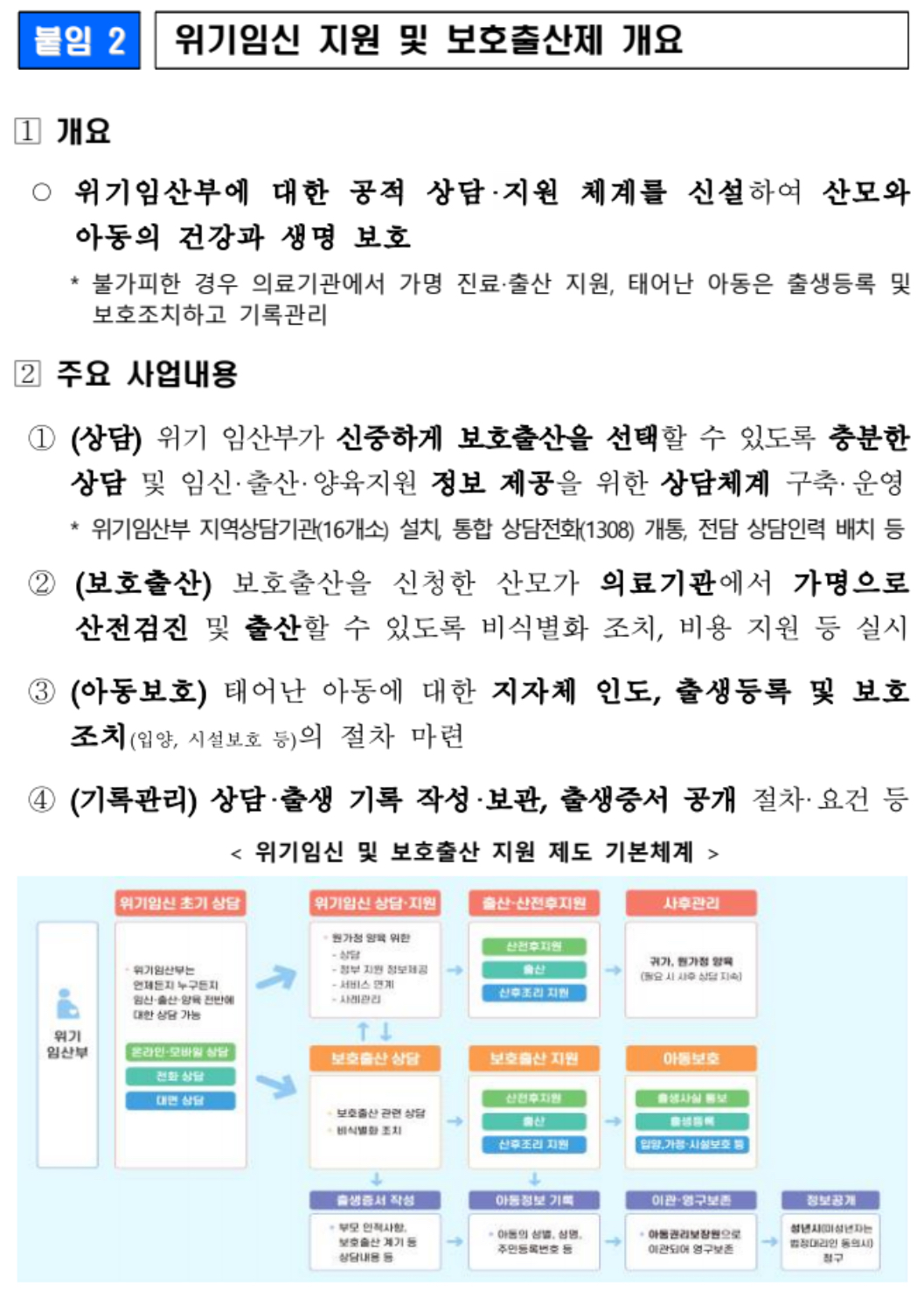 보건복지부는 두 제도가 2024년 7월 19일부터 원활하게 시행될 수 있도록 그동안 법원 행정처, 여성가족부, 관련 공공기관들과 함께 하위법령을 제정하고 위기임산부 상담기관과 1308 상담전화를 마련하였으며 제도를 편리하게 이용할 수 있도록 정보시스템을 구축하는 등 제도 시행을 준비해 왔습니다.