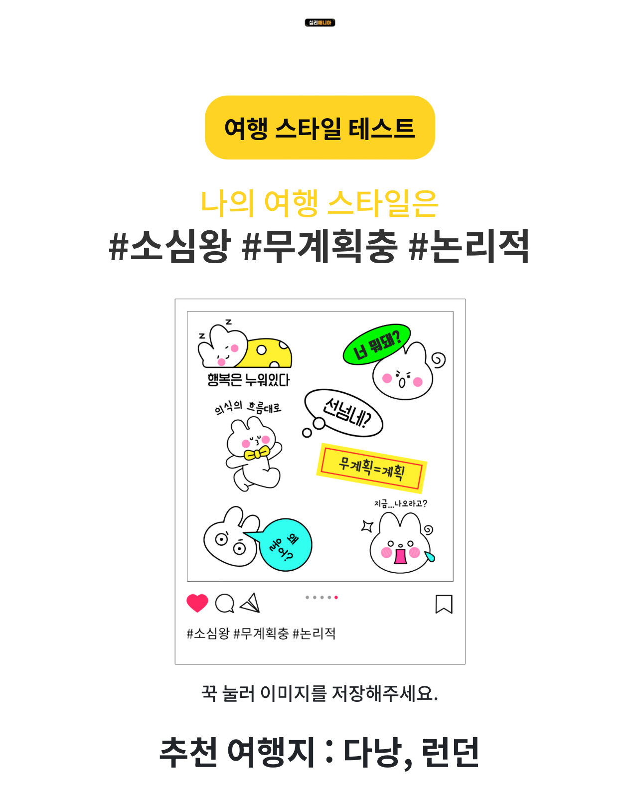 나의 여행 스타일은 #소심왕, #무계획충, #논리적이 나왔습니다.