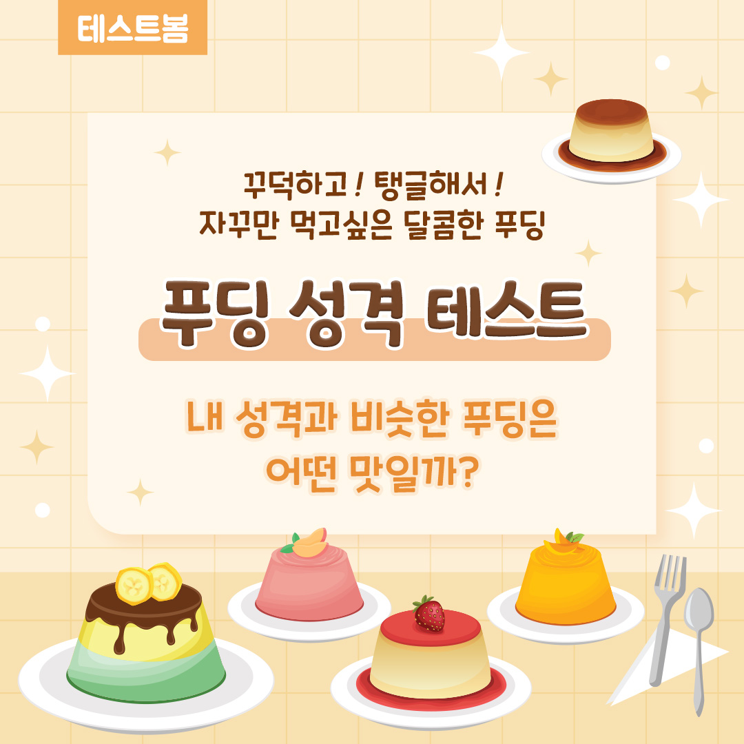 테스트봄이라는 여러 가지 다양하고 재밌는 테스트를 만드는 사이트에서 내 성격과 비슷한 푸딩은 어떤 맛일지 알아보는 테스트가 나왔는데 여러분들께 알려드리려고 합니다.