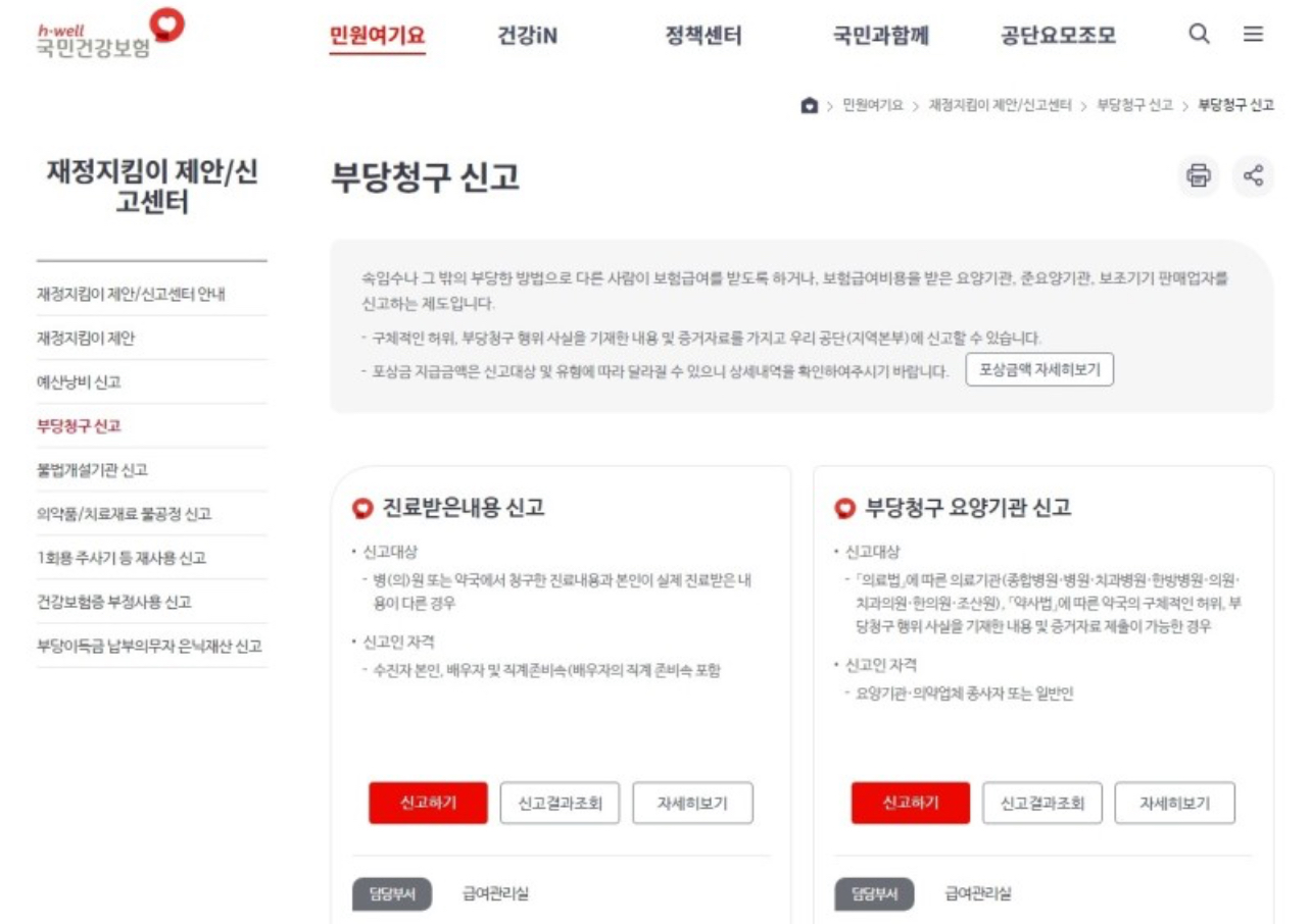 국민건강보험공단 홈페이지 > 민원여기요 > 재정지킴이 제안/신고센터 > 부당청구 신고 > 진료받은내용 신고