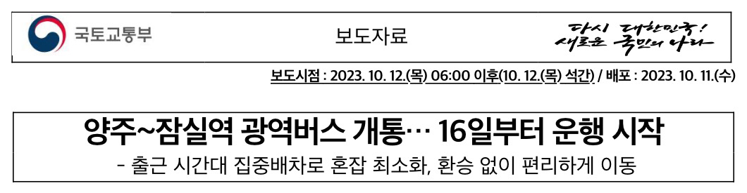 국토교통부(장관 원희룡) 대도시권광역교통위원회(위원장 강희업, 이하 대광위)는 양주시 홍죽산업단지에서 서울시로 운행하는 광역버스 준공영제 노선(1304번)이 2023년 10월 16일(월)부터 운행한다고 밝혔습니다.
