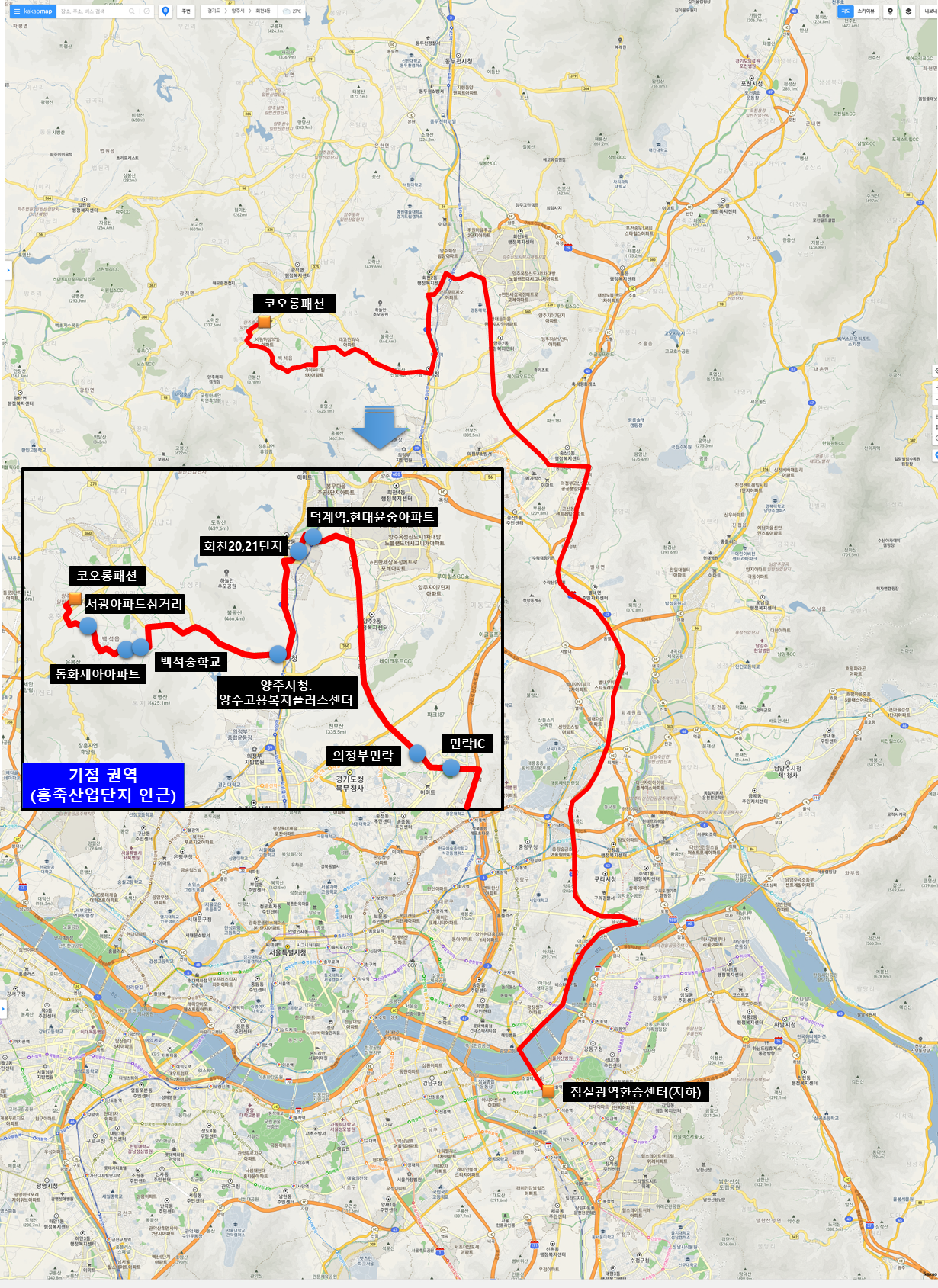 * (주요 경로) 홍죽산업단지 → 백석중학교 → 양주시청 → 회천지구 → 덕계역 → 의정부민락 → 민락IC → 잠실광역환승센터