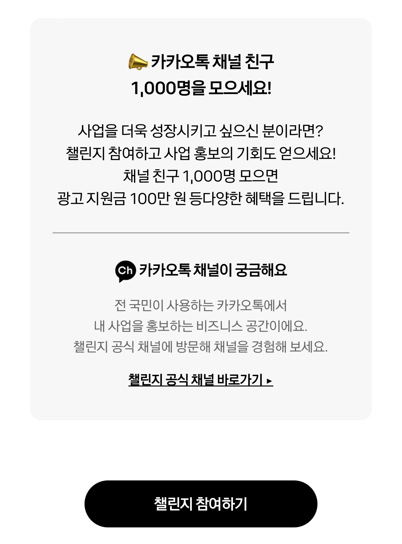 신청 완료 후 오는 12월 31일까지 카카오가 제공하는 미션 ‘카카오톡 채널 친구 1000명 만들기’를 달성하면 챌린지는 종료됩니다.