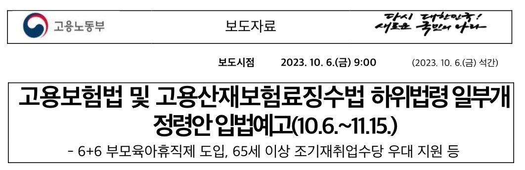 2023년 10월 6일 고용노동부가 입법예고한 고용보험법 시행령·고용산재보험료징수법 시행령 개정령안은 △6+6 부모 육아휴직제 도입 △중소기업 고용보험료율 인상 유예 △장년층 조기재취업수당 지급 내용을 담고 있습니다.