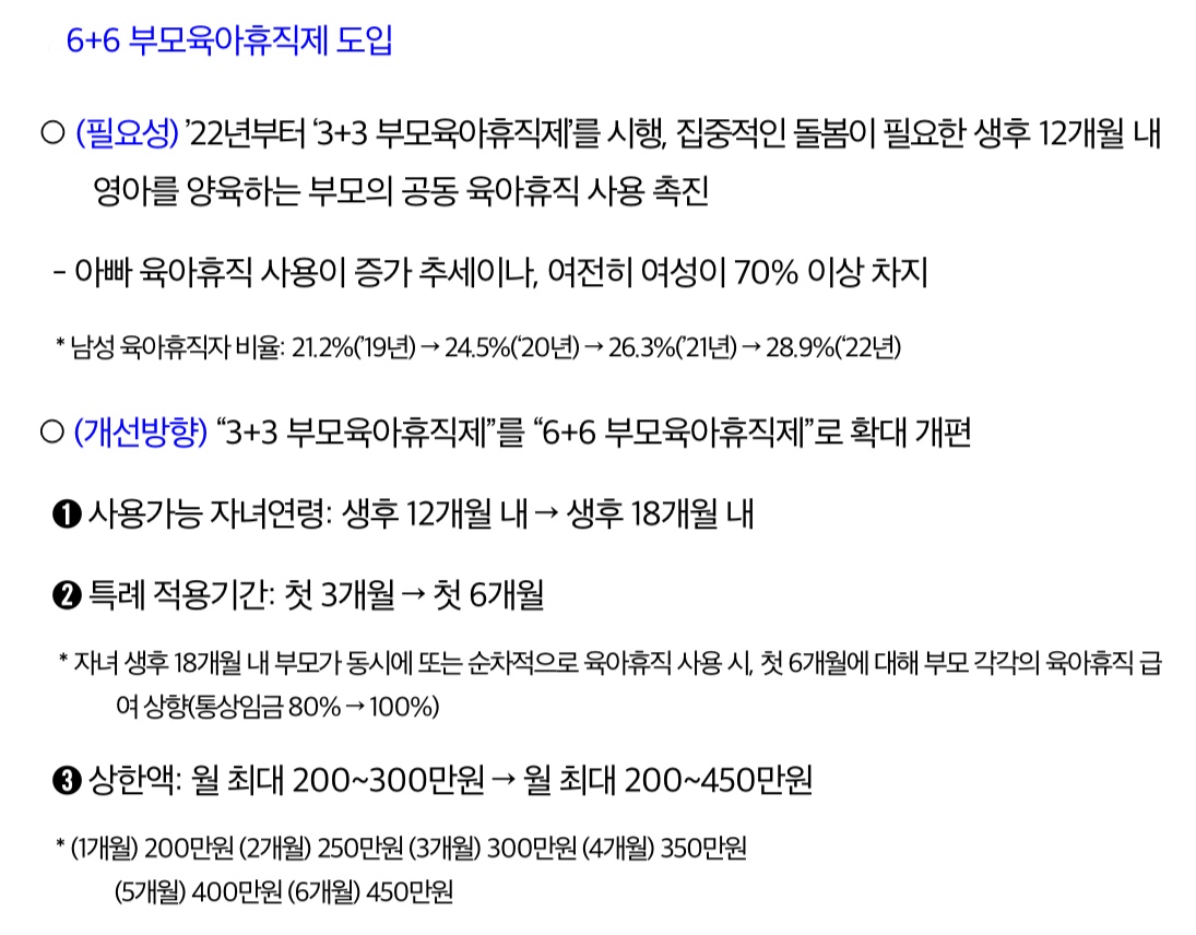 6+6 육아휴직제는 윤석열 대통령이 올해 2023년 3월 주재한 저출산고령사회위원회에서 발표하면서 구체화하기 시작했는데 육아휴직에 대한 부담을 줄여줘 출산율을 끌어올리겠다는 게 정부의 구상입니다.