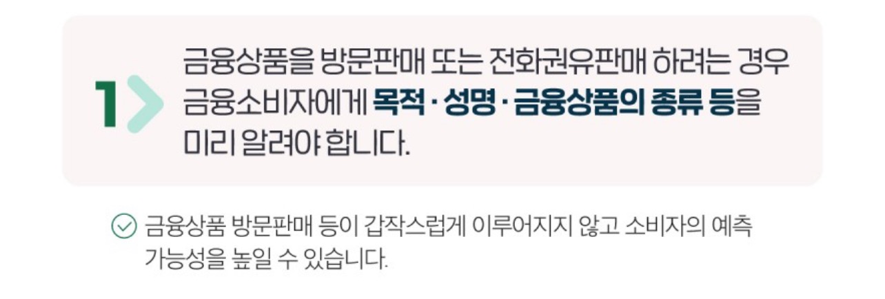 1. 금융상품을 방문판매 또는 전화권유판매 하려는 경우 금융소비자에게 목적·성명·금융상품의 종류 등을 미리 알려야 함