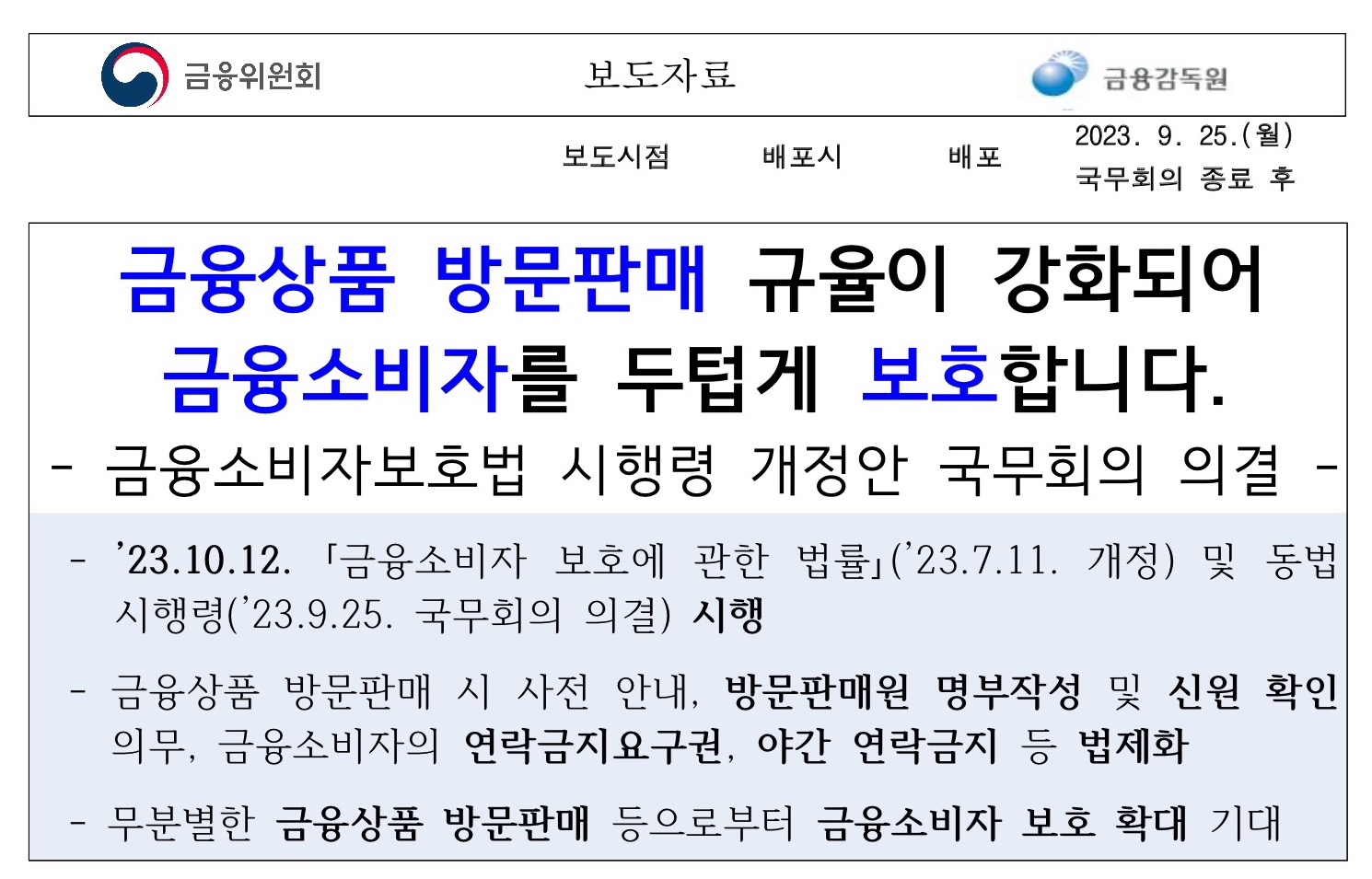 금융소비자보호법(이하 ‘금소법’) 시행령 개정안이 2023.9.25. 국무회의에서 의결됨에 따라, 개정 금소법과 함께 2023년 10월 12일 시행되어 금융상품 방문판매 및 전화권유판매(이하 ‘방문판매 등’) 관련 규제가 적용될 예정이라고 합니다.