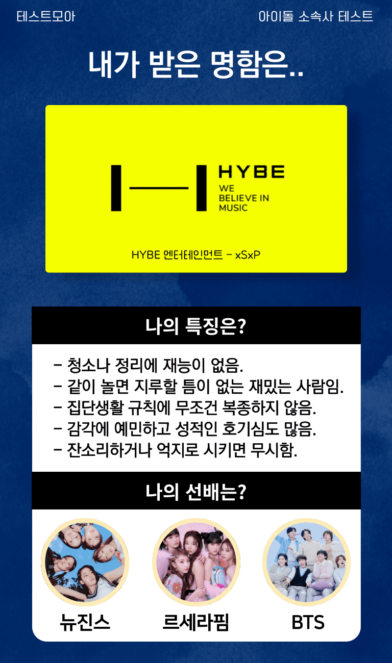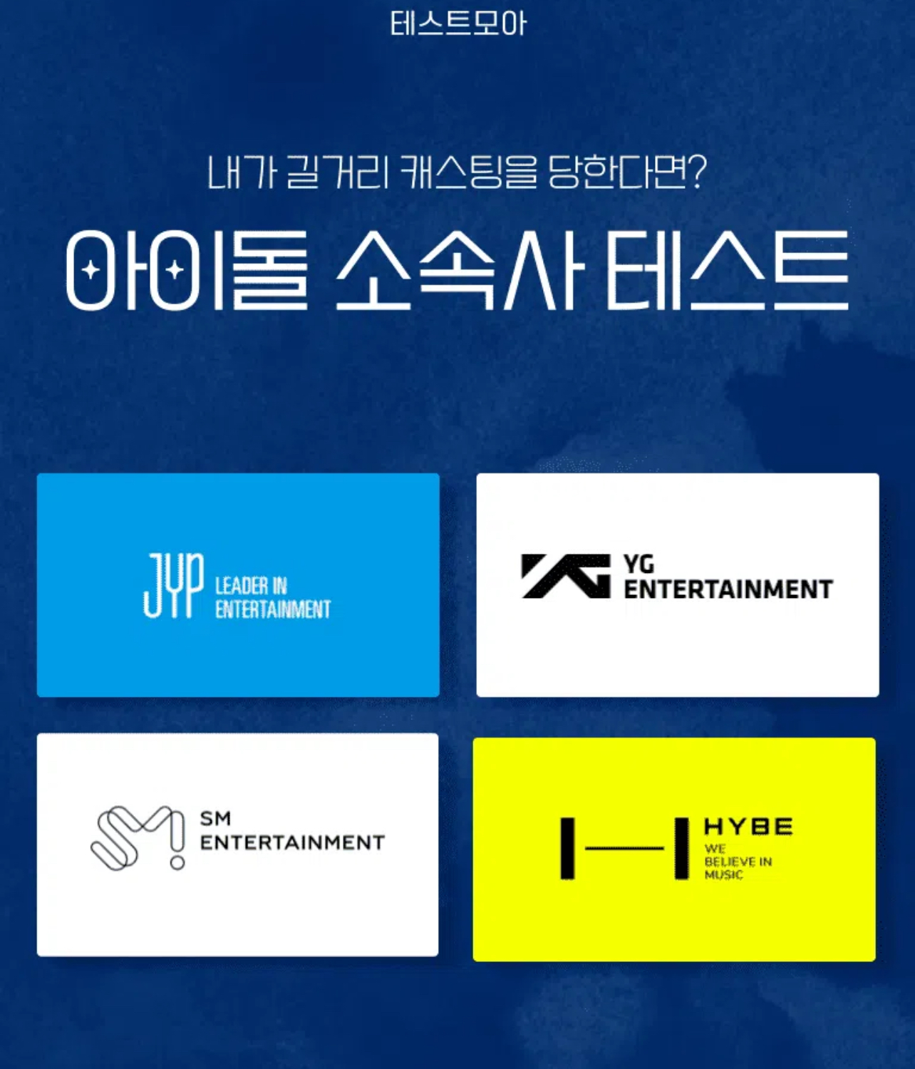 우리나라에는 JYP, YG, SM, 하이브 등 다양한 아이돌 소속사가 존재하는데 테스트모아에서 과연 내가 길거리 캐스팅을 당한다면 어디 소속사가 어울릴지 알아보는 테스트가 있어서 알려드리려고 합니다.