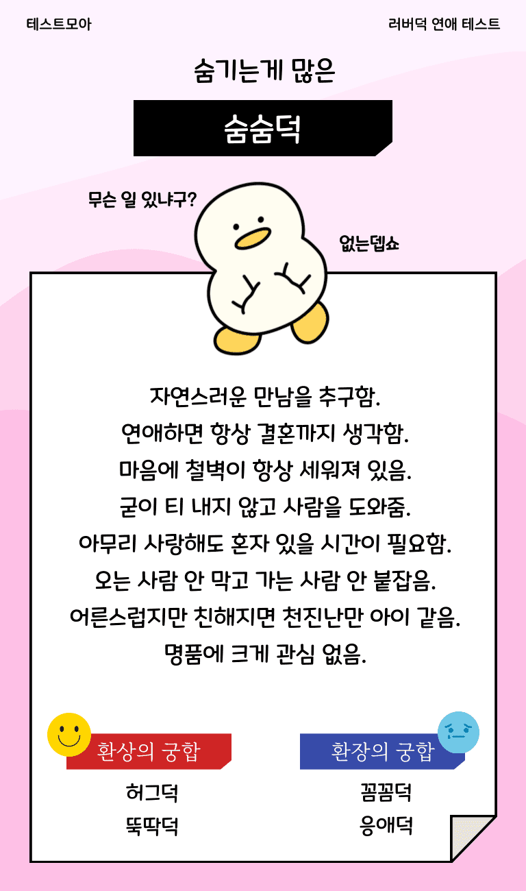 뚝딱덕, 궁금덕, 응애덕, 곰곰덕 등 다양한 오리 중 여러분의 러버덕을 찾아볼 수 있는 러버덕 연애 테스트가 테스트모아에서 새롭게 등장했는데 이에 소개드리겠습니다.
