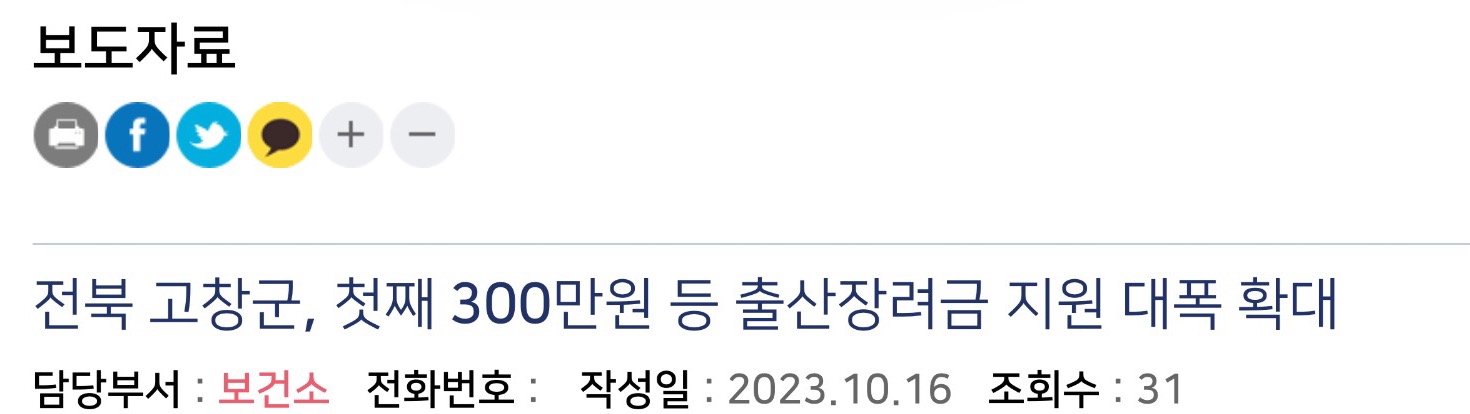 현재 고창군 신생아 1명당 출산장려금 지원은 첫째 100만원, 둘째 200만원, 셋째 500만원, 넷째 700만원, 다섯째 이상부터 1000만원인데 고창군은 출산에 따른 경제적 부담을 해소하고 출산을 배려하는 사회 분위기를 조성하기 위해 고창군 출산장려금 지원 확대를 추진해 왔다고 합니다.