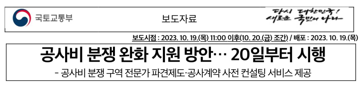 국토교통부(장관 원희룡)는 2023년 10월 20일(금)부터 정비사업에서 조합과 시공사 간 공사비 분쟁을 완화하기 위한 지원 방안을 시행한다고 합니다.