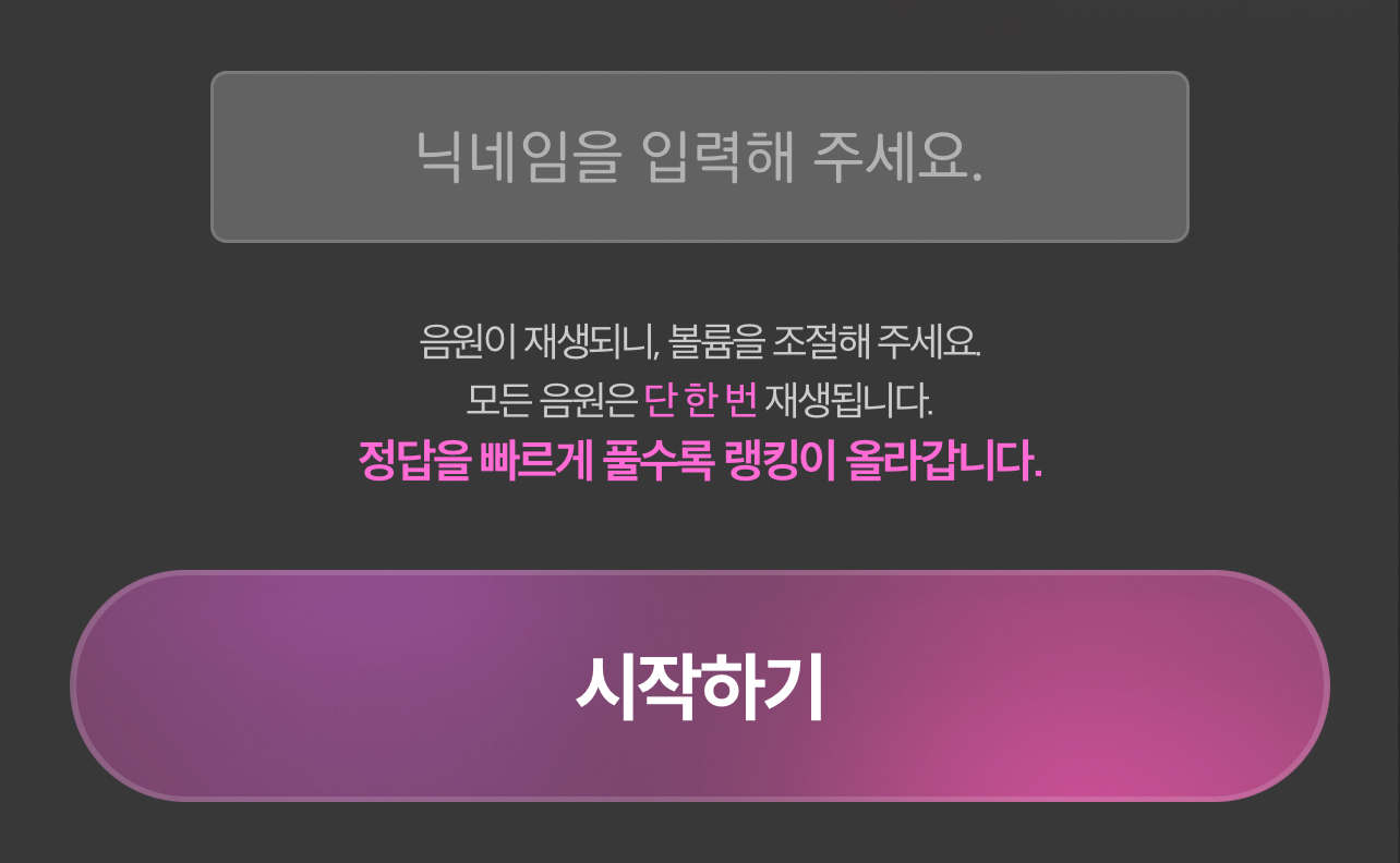 그리고 음원이 재생되니 볼륨을 조절해 주고 모든 음원은 단 한 번 재생되며 정답을 빠르게 풀수록 랭킹이 올라간다고 합니다.