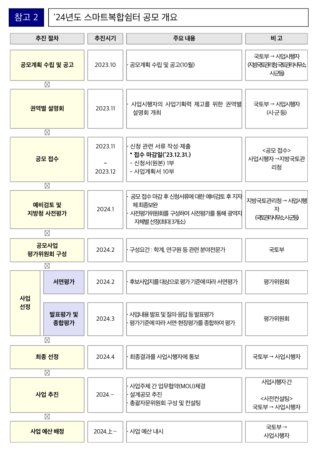 국토교통부는 외부 전문가로 구성된 평가위원회의 심사를 거쳐 2024년 4월까지 사업대상지 5개소를 최종 선정*할 예정