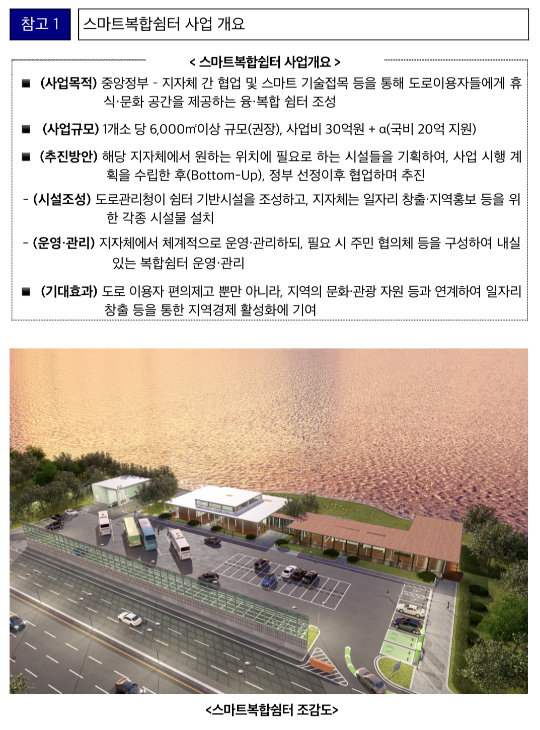 스마트복합쉼터는 일반 국도 이용자들에게 스마트 기술을 기반으로 한 휴식과 문화 공간을 함께 제공하는 융·복합 쉼터로, 중앙정부와 지자체 간 협업을 통해 조성된다고 합니다.