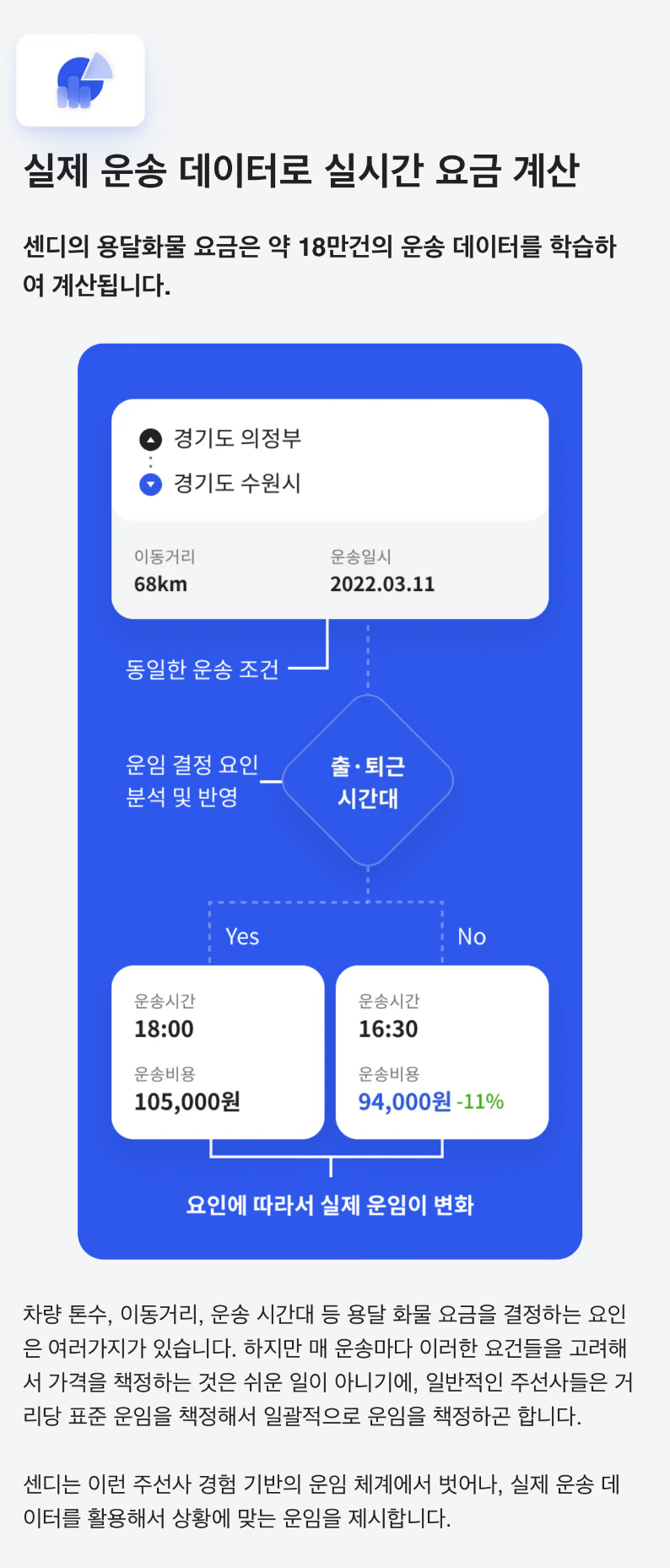 센디의 용달화물 요금은 약 18만 건의 운송 데이터를 학습하여 계산된다고 합니다.