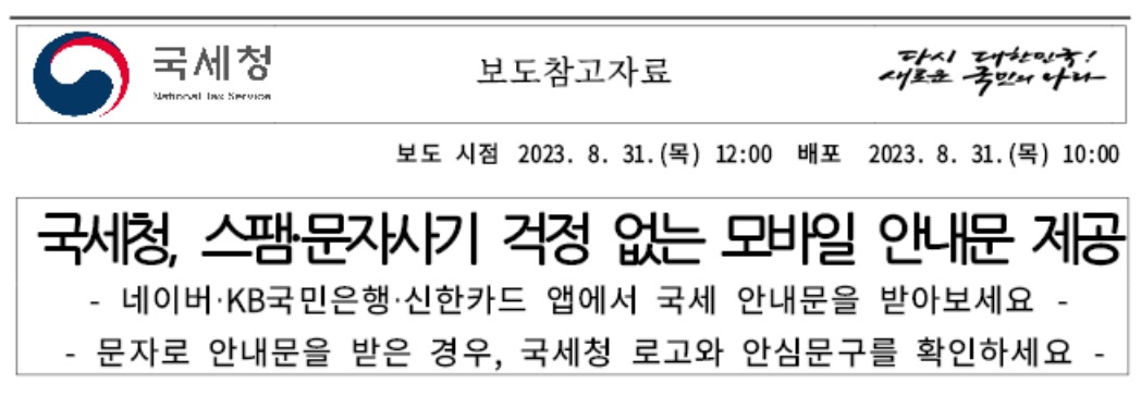 앱을 통한 모바일 안내문은 발송사업자의 로고와 전자문서 문구가 포함된 알림(푸시)을 누르거나 각 앱에 개설된 국세청 전용 전자문서함을 통해서 스팸, 문자사기 걱정 없이 안심하고 안내문을 확인할 수 있다고 합니다.