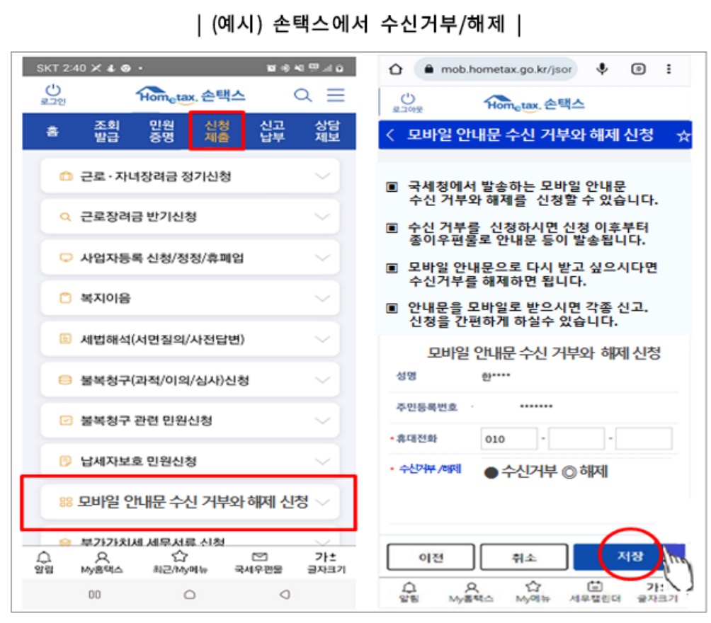 모바일 안내문 이용이 어렵거나 불편한 분들은 홈택스(손택스)나 ARS로 간편하게 모바일 안내문 수신을 거부하거나 수신거부를 해제할 수 있으며 수신거부를 하면 종전과 같이 종이 우편물로 안내문을 받으실 수 있도록 하여 불편함이 없도록 하겠습니다고도 합니다.