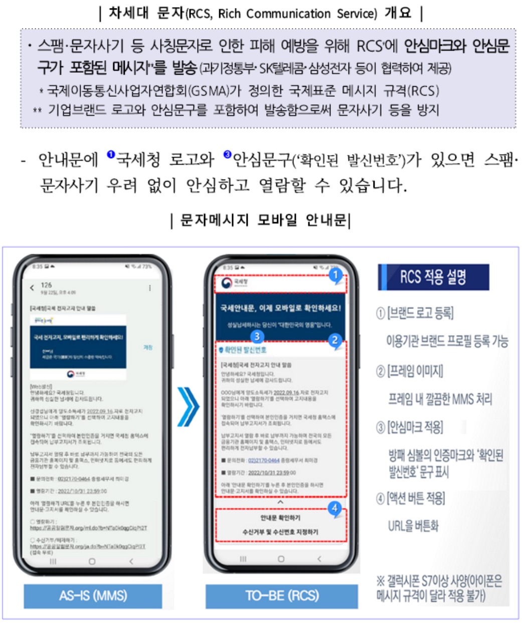 2023년 9월부터는 문자메시지(MMS) 기반의 모바일 안내문에 보안이 강화된 차세대 문자(RCS)와 안심마크를 적용할 예정이라고도 합니다.