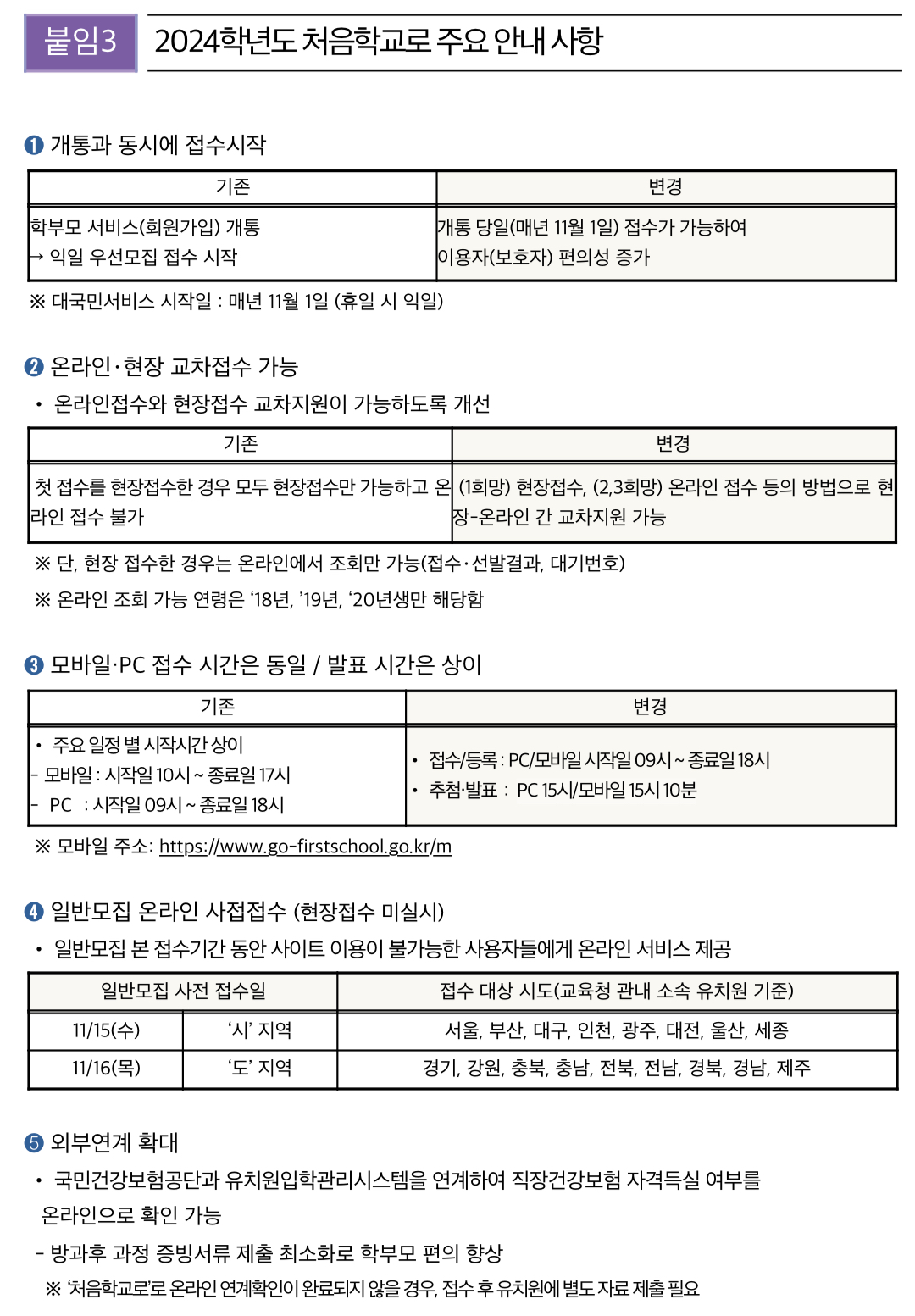 아울러, 학부모 편의성을 제고하기 위해 2024학년도부터 △ 온라인·현장 교차 원서접수 서비스, △ 모바일 학부모 서비스 시간 확대, △ 국민건강보험공단과의 연계 확대로 업무 간소화, △ 관심유치원 등록 기능을 통한 자동 알림 서비스 등이 새롭게 제공된다고 합니다.