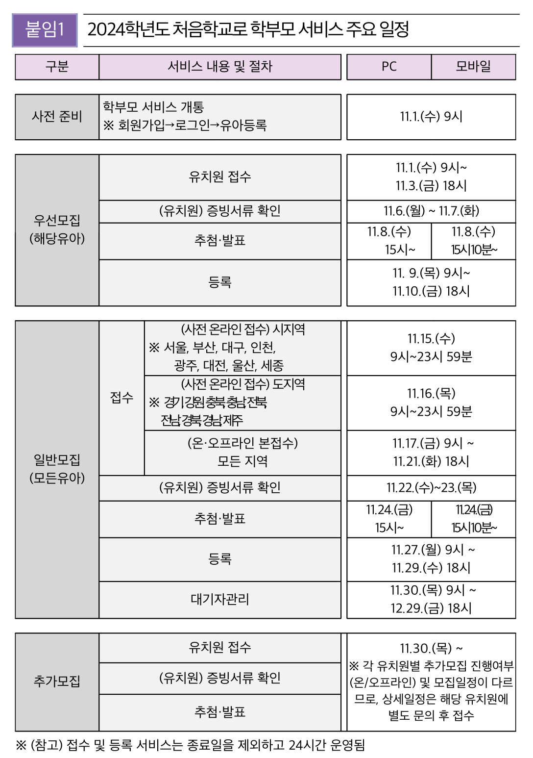 교육부(부총리 겸 교육부장관 이주호)와 한국교육학술정보원(원장직무대리 신명호)은 2024학년도 국・공・사립유치원 유아모집을 위한 ‘처음학교로’ 서비스를 2023년 11월 1일(수)부터 시작한다고 밝혔습니다.
