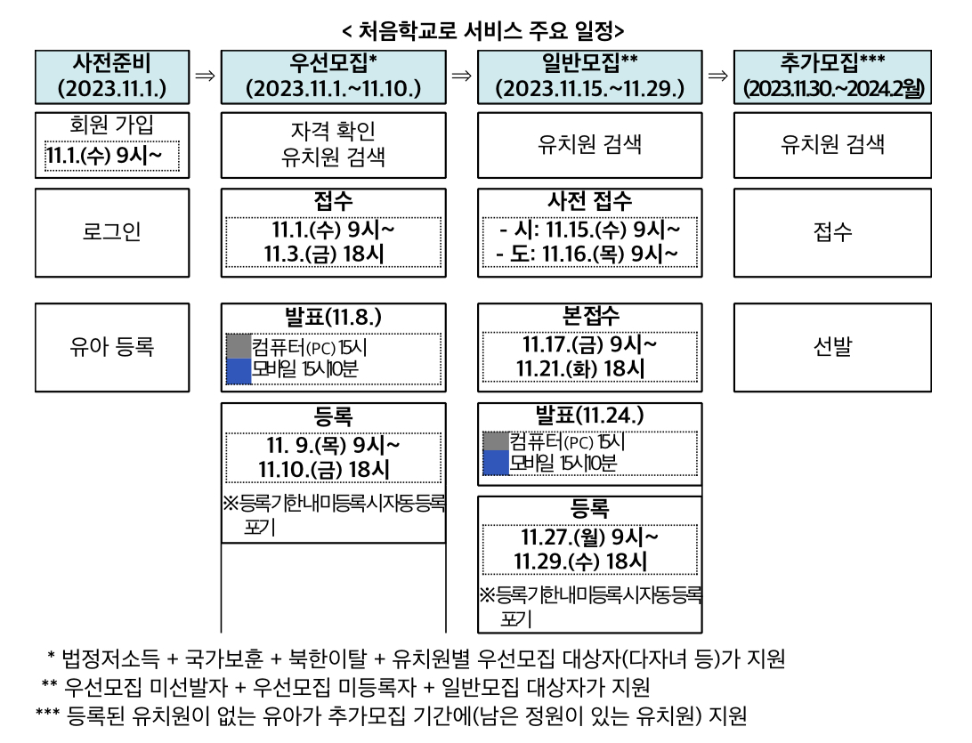 자녀가 유치원에 입학하기를 희망하는 학부모는 2023년 11월 1일(수) 9시부터 열리는 처음학교로에 회원가입 후 유아 정보를 등록하고 모집 유형별(우선·일반모집)로 희망하는 유치원(3희망까지 가능)에 접수할 수 있습니다.