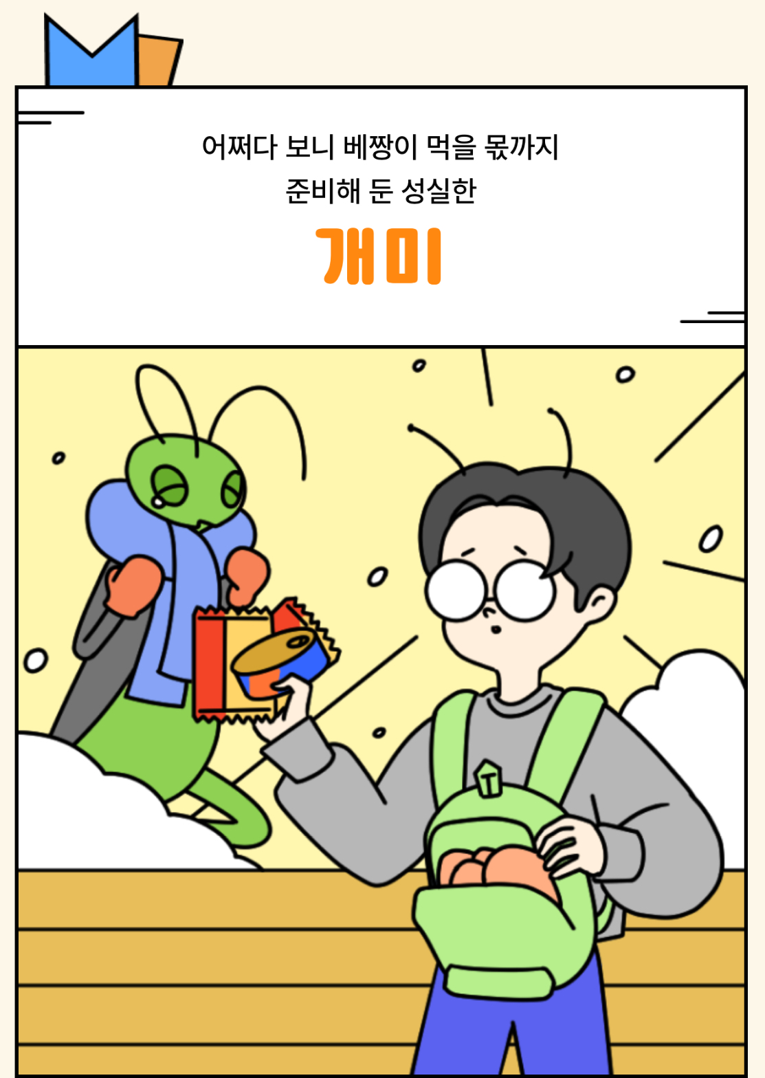 어쩌다 보니 베짱이 먹을 몫까지 준비해 둔 성실한 개미가 나왔습니다.