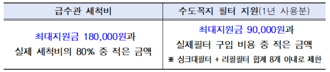 급수관 세척비와 수도꼭지 필터는 중복 지원이 불가하며, 수도꼭지 필터 지원은 마시는 물을 기준으로 사용되는 싱크대 수도꼭지의 필터를 지원한다고 합니다.