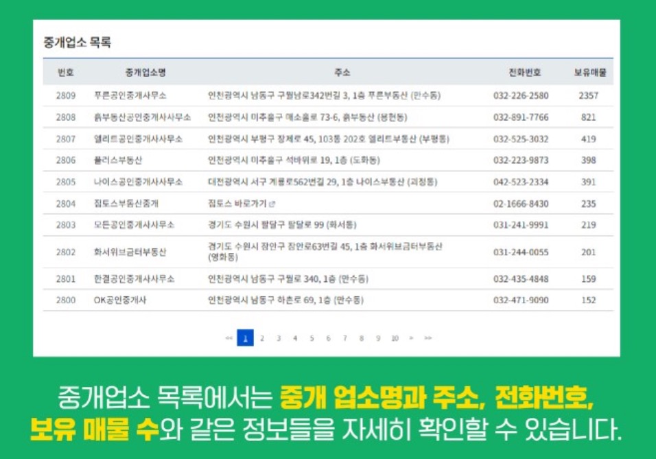 그리고 중개업소 목록을 통해서 중개업소명과 주소, 전화번호, 그리고 보유 매물 수와 같은 자세한 정보들도 확인하실 수 있습니다.