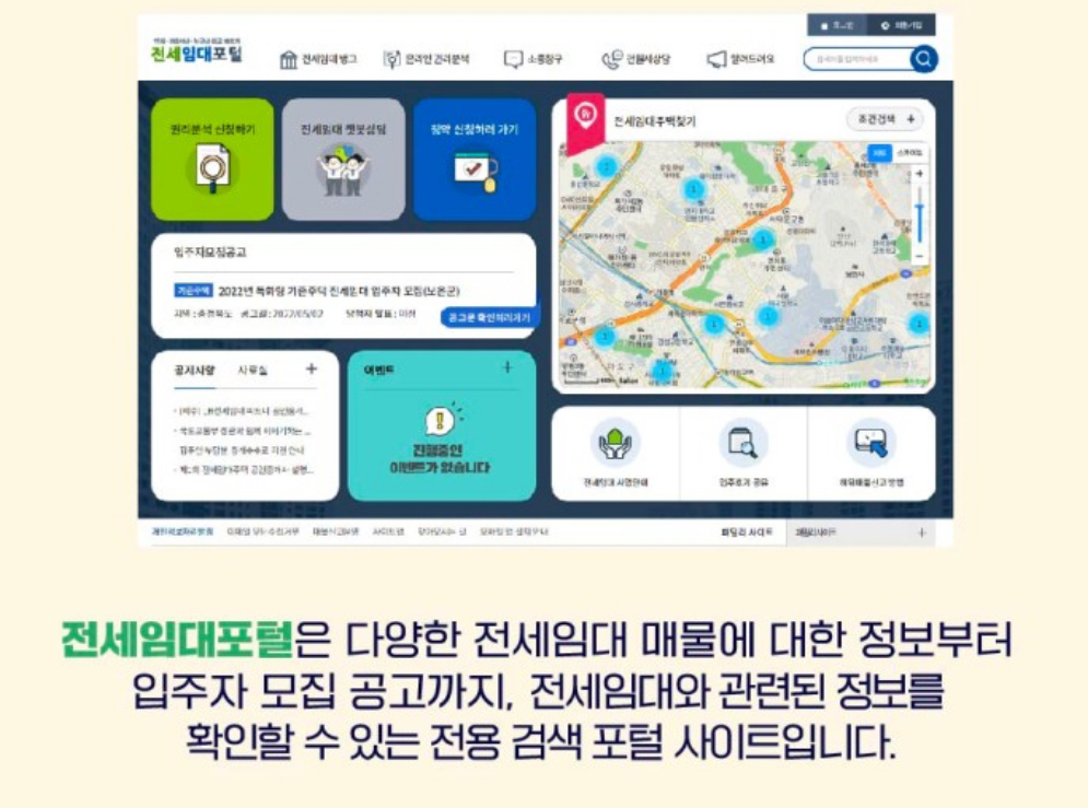 전세임대포털이란 다양한 전세임대 매물에 대한 정보부터 입주자 모집 공고까지 전세임대와 관련된 정보를 확인할 수 있는 전용 검색 포털 사이트입니다.