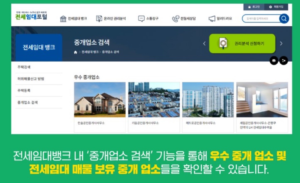 전세임대뱅크 내 '중개업소 검색' 기능을 통해 우수 중개 업소 및 전세임대 매물 보유 중개 업소들을 확인하실 수 있습니다.