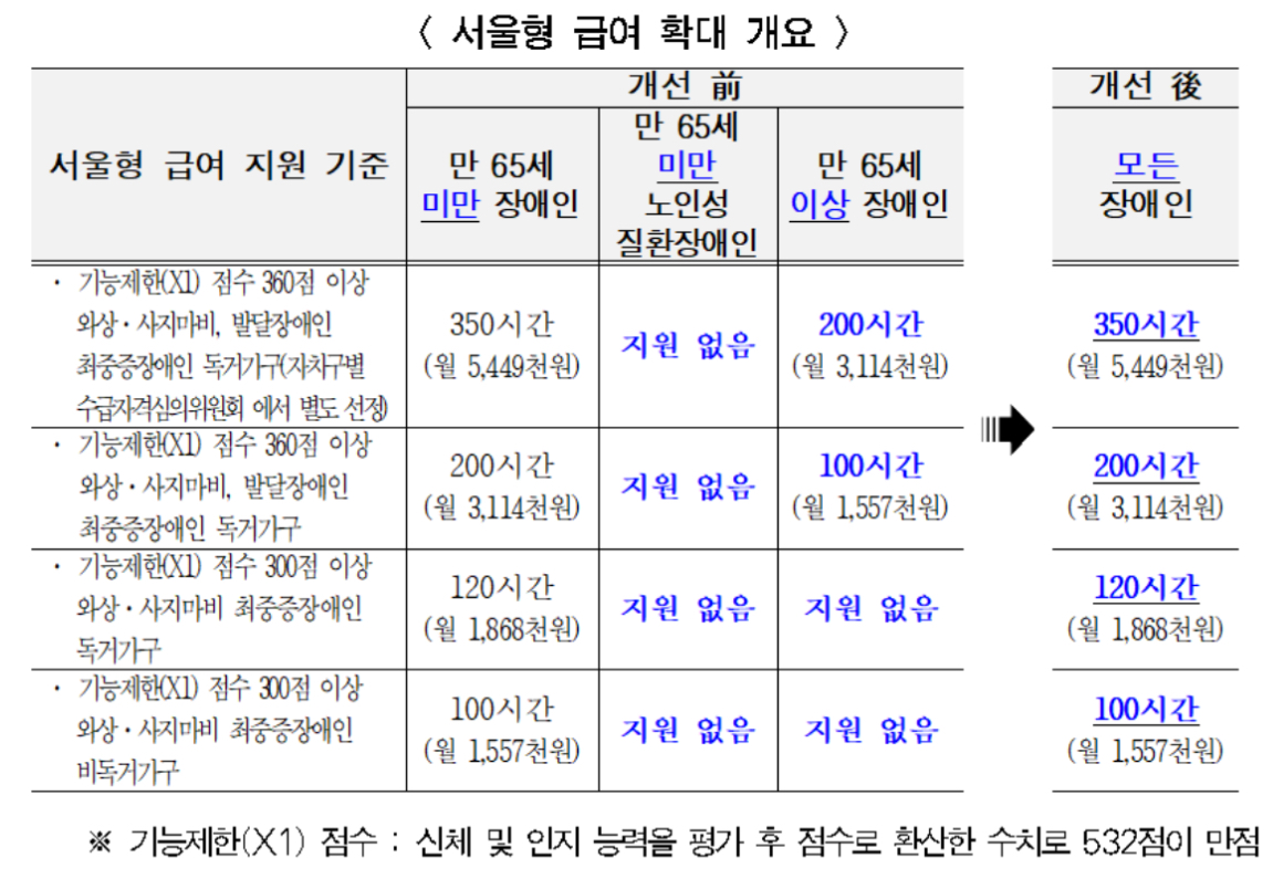 서울형 급여는 서울시 거주 장애인을 대상으로 장애 정도와 가정환경 등에 따라 최대 월 350시간(544만 9000원)에서 최소 월 100시간(155만 7000원)을 지원한다고 합니다.