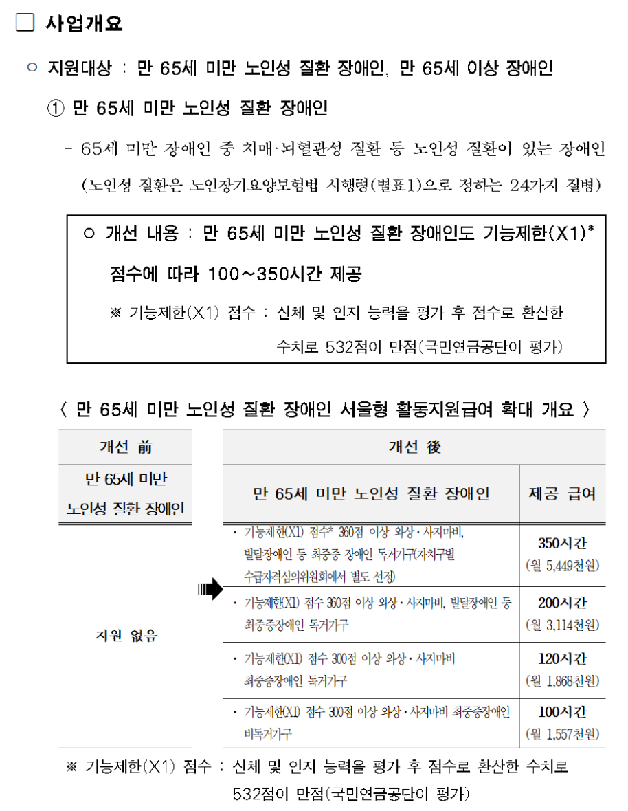법적 근거가 마련되어 이번에 서울형 급여 제도개선을 통하여 만 65세 미만 노인성 질환 장애인까지 포함하게 되었고 2023년 11월에 신청하시면 2023년 12월부터 지원받을 수 있습니다.