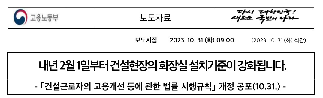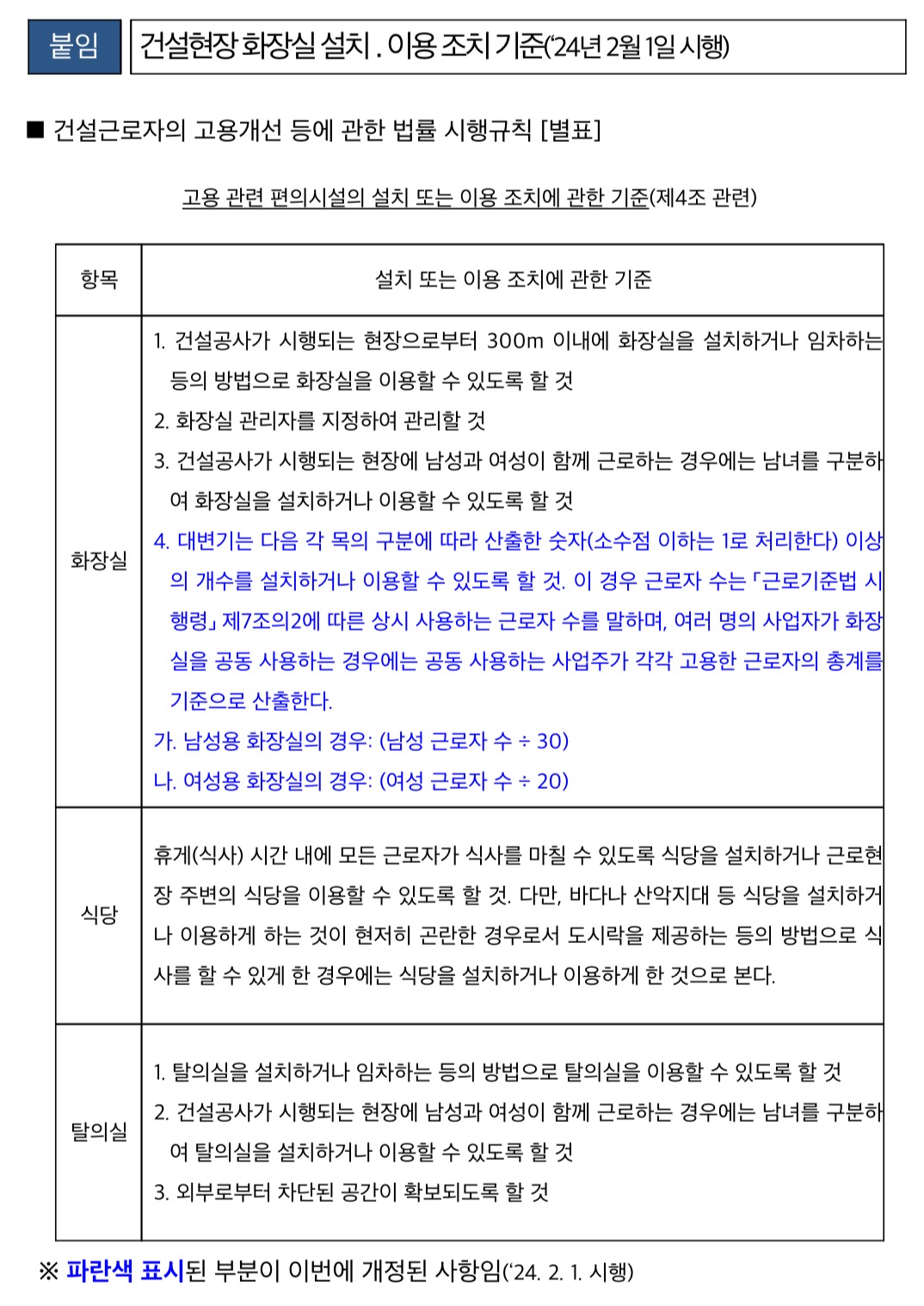 고용노동부(장관 이정식)는 건설근로자 보호를 위하여 기존의 화장실 설치기준에 ‘근로자 수 기준’을 추가한 「건설근로자의 고용개선 등에 관한 법률(이하 ‘건설근로자법’) 시행규칙」개정안을 2023년 10월 31일 공포(2024년 2월 1일 시행)했다고 합니다.