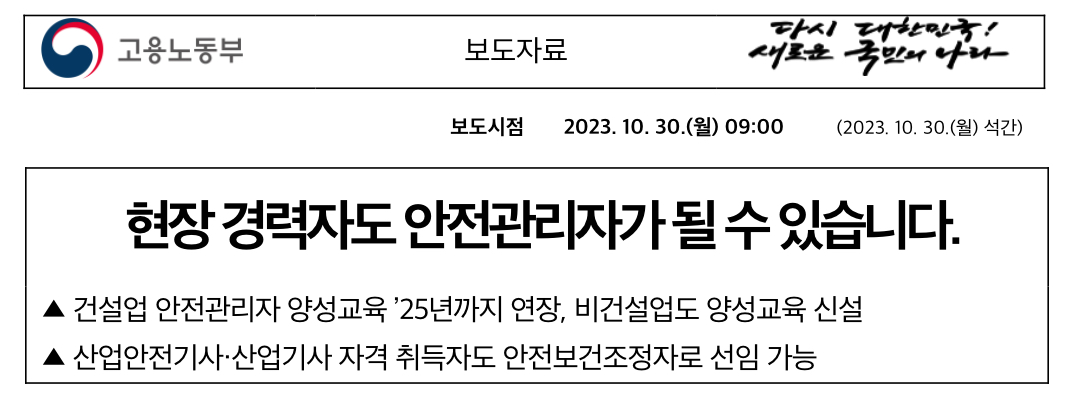 고용노동부(장관 이정식)는 현장 안전관리자 및 안전보건조정자 선임에 관한 산업안전보건법 시행령 개정안을 2023년 10월 30일부터 12월 9일까지 입법예고했습니다.
