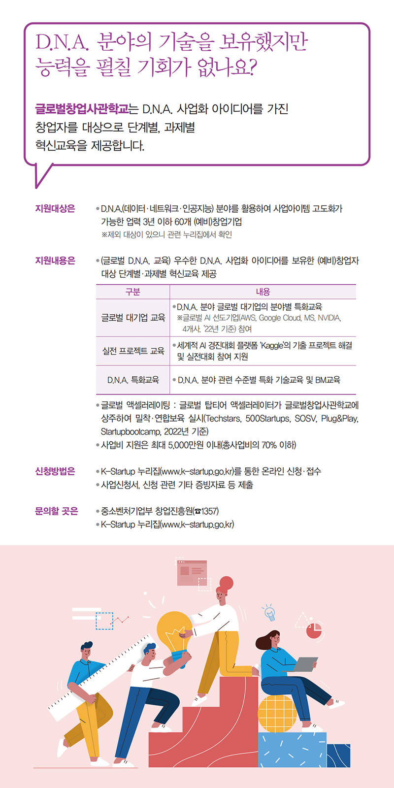 글로벌창업사관학교는 D.N.A. 사업화 아이디어를 가진 창업자를 대상으로 단계별, 과제별 혁신교육을 제공합니다.
