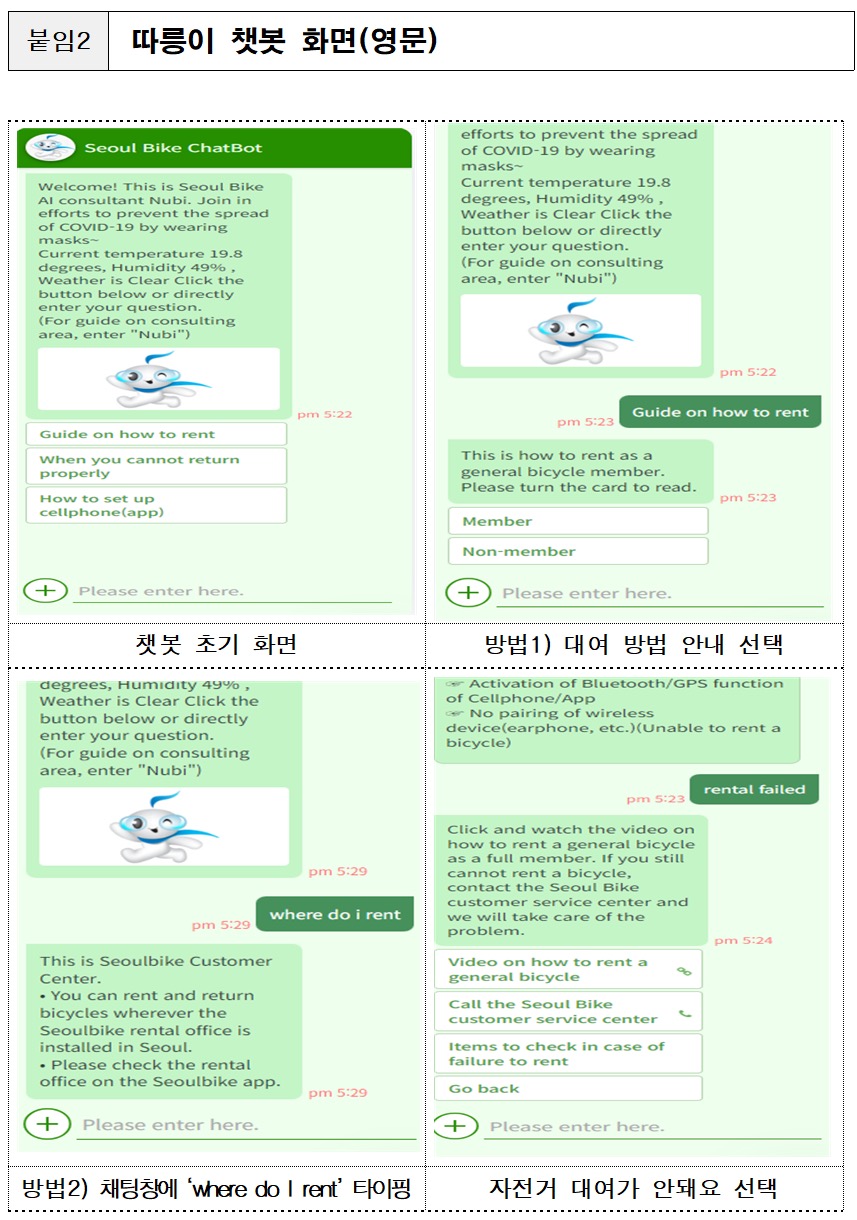현재 외국인 중 국내 거주 외국인은 내국인과 동일하게 핸드폰 번호로 회원가입 후 따릉이를 이용할 수 있으며 관광객 등 단기 체류 외국인은 최초화면에서 ‘Foreigner’를 선택하여 이용권 구매 후 따릉이를 이용할 수 있으나, 챗봇은 한국어만 가능하였다고 합니다.